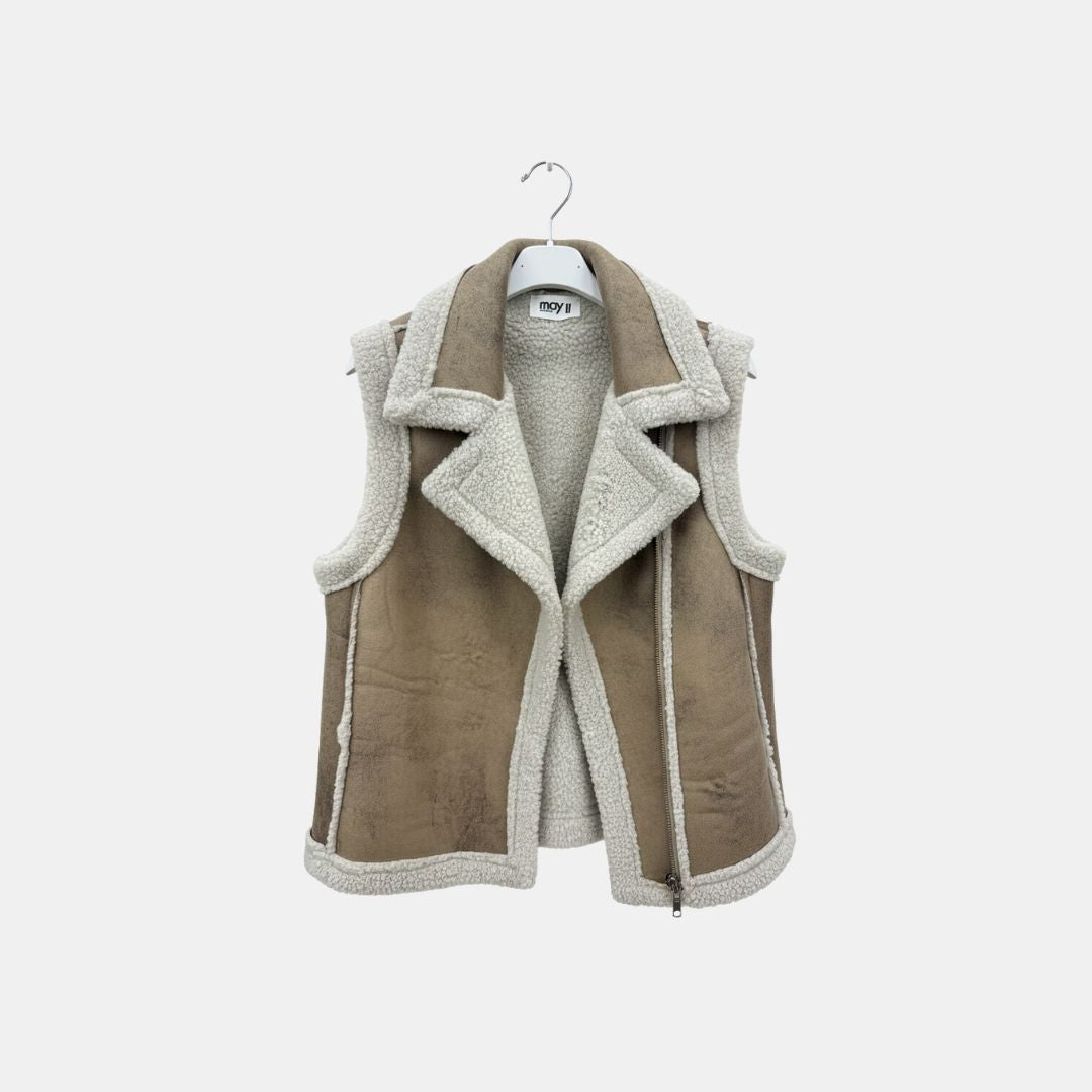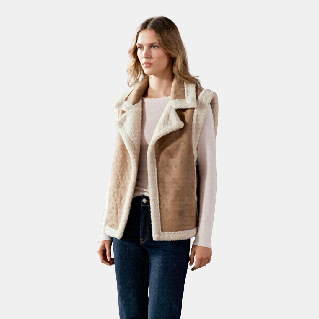Chaleco de borrego para mujer, cómodo y cálido, ideal para completar tus looks de otoño e invierno. Su diseño versátil y su interior forrado lo convierten en un básico imprescindible para el día a día.