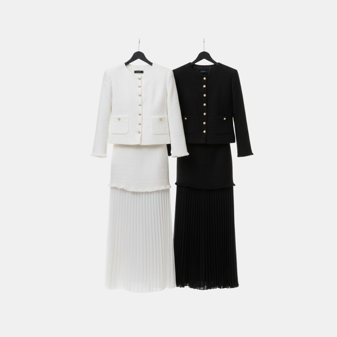 La chaqueta, de corte recto y estructurado, cuenta con cierre frontal de botones, cuello redondo y bolsillos decorativos, aportando un aire clásico y elegante. La falda larga plisada añade movimiento y ligereza al conjunto, creando un equilibrio perfecto entre estructura y fluidez.
